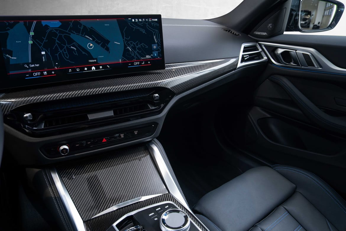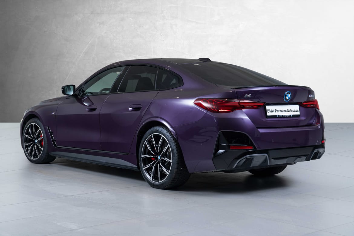 Nydelig i4 M50 xDrive i den lekre individualfargen Daytona-Violett. 50 000,- ekstra koster lakken på denne bilen. Svart skinninteriør av ypperste klasse i de deilige M-Setene, interiøret også med carbonlister og glassbryterne. Bilen har skjermbredderne og de nydelige 868M Sommerfelgene med performancedekk.