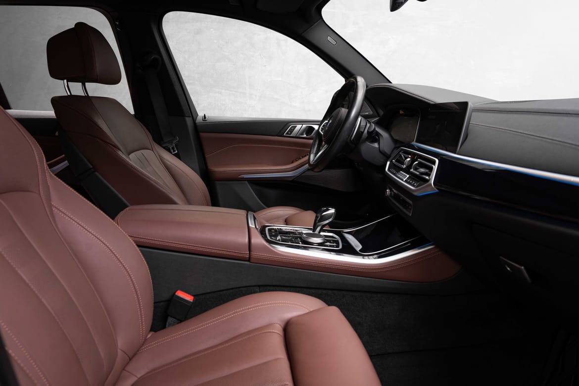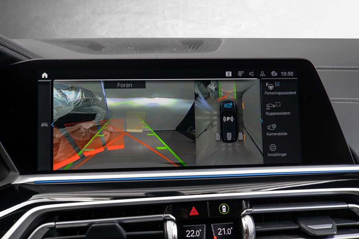 X5 xDrive45e kommer med et eksklusivt interiør med førsteklasses materialer, komfortable seter i skinn og en stilfull, moderne utforming. Den romslige kabinen gir god plass til både passasjerer og bagasje, og med et avansert infotainmentsystem (BMW iDrive), digital cockpit, og høyoppløselig skjerm, er du alltid i kontakt med verden rundt deg.Avanserte Assistansesystemer: